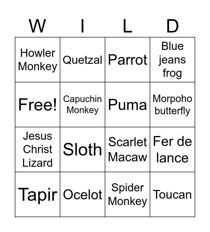 This bingo card has 16 words: Ocelot, Fer de lance, Parrot, Howler Monkey, Jesus Christ Lizard, Quetzal, Scarlet Macaw, Spider Monkey, Free!, Capuchin Monkey, Tapir, Blue jeans frog, Sloth, Morpoho butterfly, Puma and Toucan.
