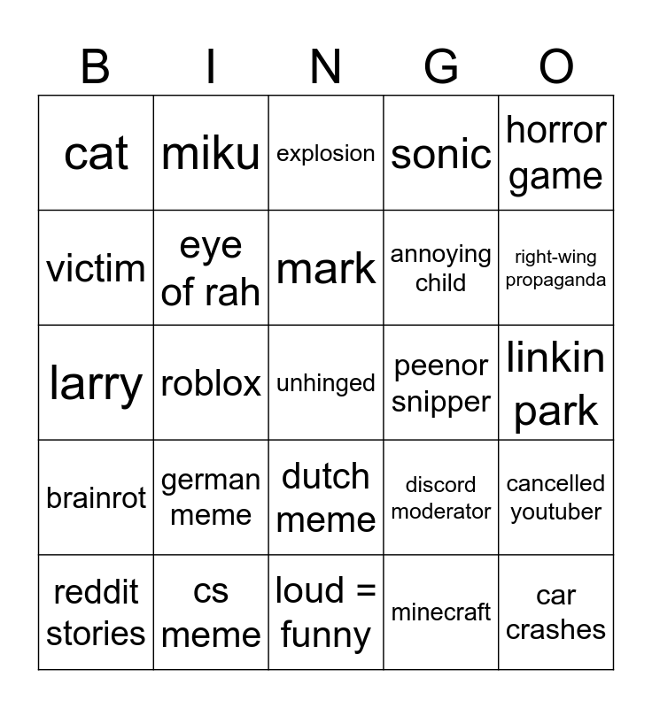 This bingo card has 25 words: german meme, loud = funny, mark, reddit stories, horror game, cat, victim, miku, peenor snipper, dutch meme, annoying child, larry, discord moderator, cancelled youtuber, eye of rah, car crashes, linkin park, explosion, right-wing propaganda, roblox, unhinged, cs meme, brainrot, sonic and minecraft.