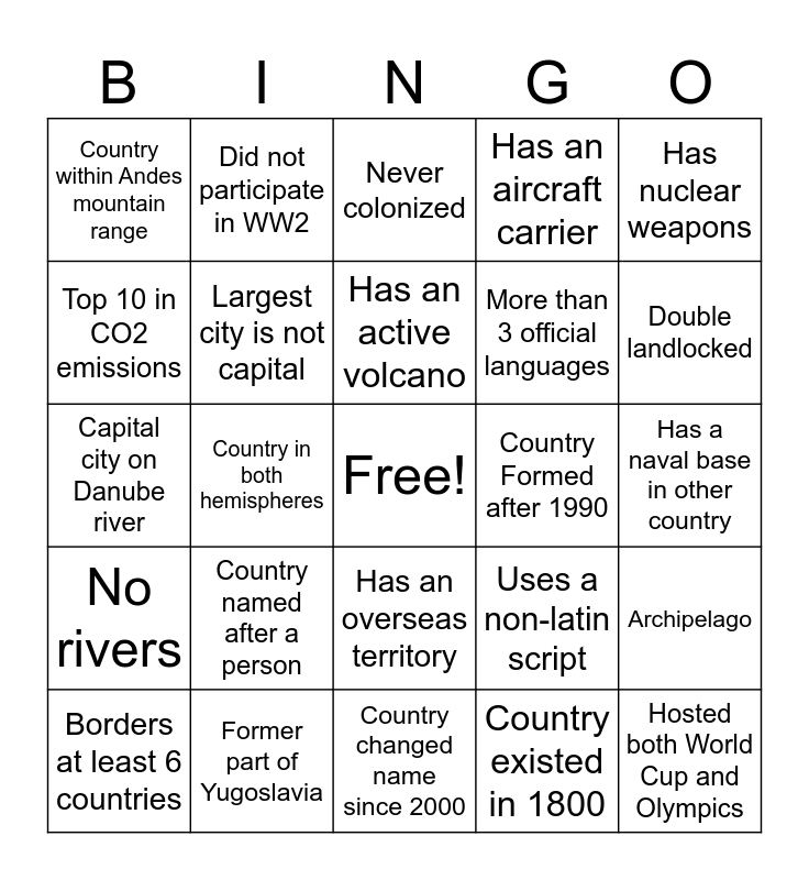 This bingo card has a free space and 29 words: Borders at least 6 countries, Portuguese official language, Country in both hemispheres, Has changed capital city, Country within Andes mountain range, Never colonized, Largest city is not capital, Country named after a person, Country Formed after 1990, Former part of Yugoslavia, Has a naval base in other country, Hosted both World Cup and Olympics, Country changed name since 2000, Country existed in 1800, Double landlocked, No standing army, Has an overseas territory, No rivers, Has nuclear weapons, Capital city on Danube river, Uses a non-latin script, Not man-made UNESCO World Heritage site, More than 3 official languages, Top 10 in CO2 emissions, Has an aircraft carrier, Did not participate in WW2, Archipelago, Has an active volcano and Has claims in Antarctica.