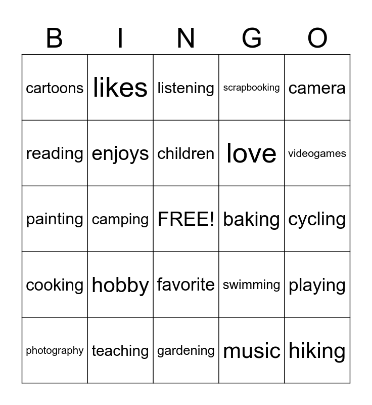 This bingo card has a free space and 24 words: hobby, teaching, children, photography, camera, cartoons, reading, likes, baking, favorite, love, painting, swimming, playing, enjoys, music, cycling, listening, videogames, camping, hiking, cooking, scrapbooking and gardening.