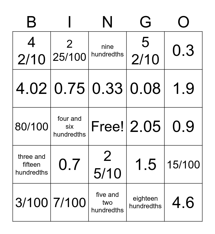 This bingo card has a free space and 24 words: 0.7, 7/100, 0.33, 3/100, 0.3, 4 2/10, 4.02, 2 25/100, 2.05, 2 5/10, 0.08, 80/100, 1.5, 15/100, 0.75, eighteen hundredths, 0.9, nine hundredths, 1.9, four and six hundredths, 4.6, three and fifteen hundredths, 5 2/10 and five and two hundredths.