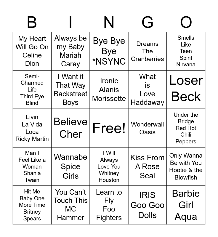 This bingo card has a free space and 24 words: Wannabe Spice Girls, You Can’t Touch This MC Hammer, Ironic Alanis Morissette, Hit Me Baby One More Time Britney Spears, Smells Like Teen Spirit Nirvana, My Heart Will Go On Celine Dion, Semi-Charmed Life Third Eye Blind, Always be my Baby Mariah Carey, Wonderwall Oasis, I Will Always Love You Whitney Houston, What is Love Haddaway, Livin La Vida Loca Ricky Martin, Kiss From A Rose Seal, Only Wanna Be with You Hootie & the Blowfish, I Want it That Way Backstreet Boys, IRIS Goo Goo Dolls, Under the Bridge Red Hot Chili Peppers, Bye Bye Bye *NSYNC, Loser Beck, Believe Cher, Barbie Girl Aqua, Man I Feel Like a Woman Shania Twain, Dreams The Cranberries and Learn to Fly Foo Fighters.