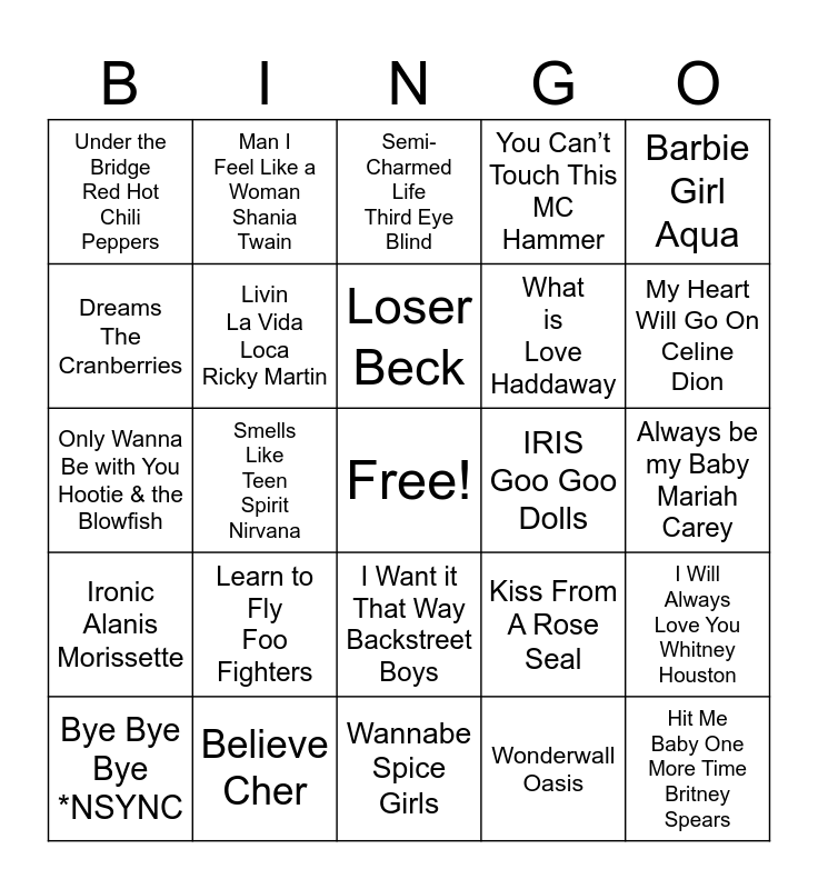 This bingo card has a free space and 24 words: Learn to Fly Foo Fighters, Believe Cher, Loser Beck, Bye Bye Bye *NSYNC, Barbie Girl Aqua, Under the Bridge Red Hot Chili Peppers, Dreams The Cranberries, Man I Feel Like a Woman Shania Twain, IRIS Goo Goo Dolls, I Want it That Way Backstreet Boys, What is Love Haddaway, Only Wanna Be with You Hootie & the Blowfish, Kiss From A Rose Seal, I Will Always Love You Whitney Houston, Livin La Vida Loca Ricky Martin, Wonderwall Oasis, Always be my Baby Mariah Carey, Semi-Charmed Life Third Eye Blind, My Heart Will Go On Celine Dion, Smells Like Teen Spirit Nirvana, Hit Me Baby One More Time Britney Spears, Ironic Alanis Morissette, You Can’t Touch This MC Hammer and Wannabe Spice Girls.