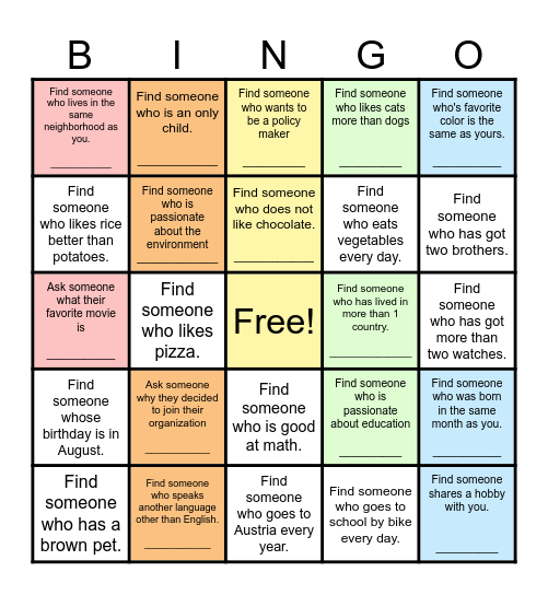 This bingo card has a free space and 45 words: Ask someone about a current project within their organization. ____________, Ask someone why they decided to join their organization ___________, Find someone who is left handed. ___________, Find someone who identifies with more than one nationality ____________, Find someone who has the same pet as you (or no pet if you don't have one). ___________, Find someone who has the same favorite food as you ___________, Find someone who is passionate about the environment _____________, Find someone who has 3 or more siblings. ___________, Find someone who likes cats more than dogs __________, Find someone shares a hobby with you. __________, Find someone who lives in the same neighborhood as you. ___________, Find someone who speaks another language other than English. ____________, Find someone who is passionate about education __________, Find someone who was born in the same month as you. ___________, Fins someone who does not want to live in Boston _____________, Find someone whose passionate about art ___________, Find someone who wants to be a policy maker __________, Find someone who has lived in more than 1 country. ______________, Ask someone the first thing they would change if they had the power to do so ___________, Ask someone what their favorite movie is ___________, Find someone who is an only child. ___________, Find someone who does not like chocolate. ___________, Find someone who has met a famous person. _____________, Find someone who's favorite color is the same as yours. ___________, Find someone who is wearing a blue shirt. ____________, Find someone who has a brown pet., Find someone who takes baths, not showers., Find someone who often eats at McDonalds®., Find someone who goes to school by bike every day., Find someone who has got more than two watches., Find someone who comes from a different country., Find someone who drinks tea for breakfast., Find someone who goes to Austria every year., Find someone who speaks more than two, languages., Find someone whose birthday is in August., Find someone who loves spiders., Find someone who is good at math., Find someone who does not like broccoli., Find someone who has got two brothers., Find someone who likes rice better than potatoes., Find someone who likes pizza., Find someone who has got a green, a blue and a yellow T-shirt., Find someone who eats vegetables every day. and Find someone who can swim very fast..