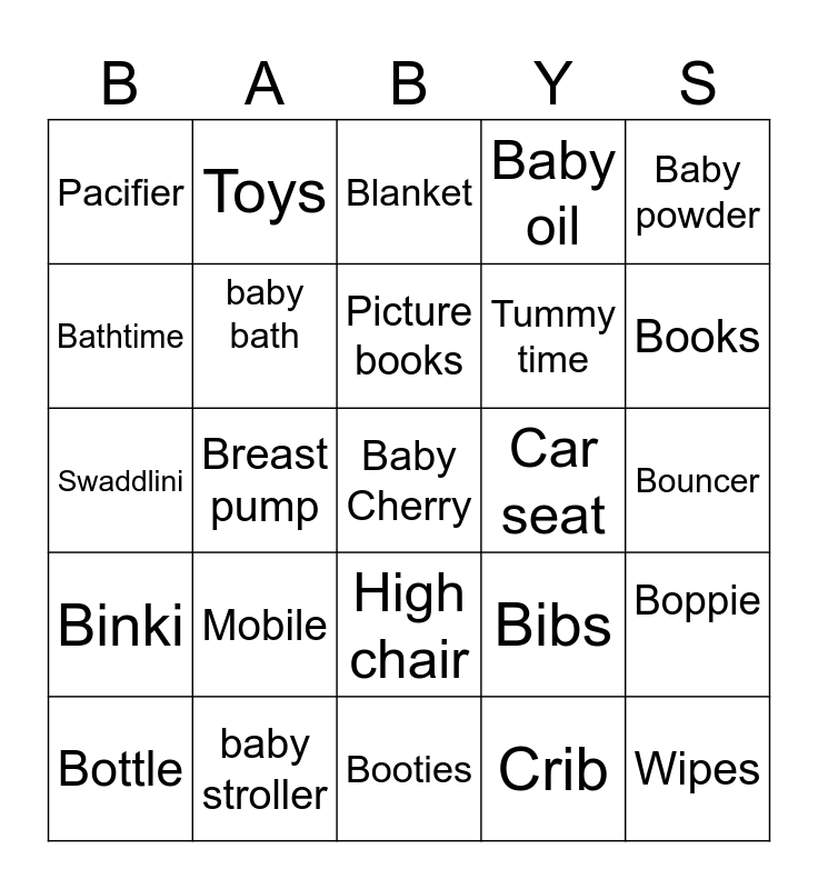 This bingo card has a free space and 44 words: Diaper, Wipes, Onesie, Bottle, Rattle, Crib, Blanket, Burp cloth, Baby powder, baby stroller, Baby oil, Car seat, High chair, Mobile, Socks, Booties, Thermometer, Swaddlini, Playmat, Books, Toys, Lullaby, Sippy cup, Pacifier, Changing pad, Bouncer, Receiving blanket, Washcloths, Bibs, Binki, Swing, Boppie, Teething, Diaper bag, Breast pump, Diaper cream, Baby monitor, Cradle, Picture books, Bathtime, Tummy time, Baby shampoo, baby bath and Pack’n Play.