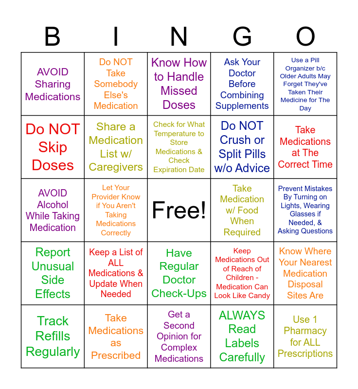 This bingo card has a free space and 24 words: Keep a List of ALL Medications & Update When Needed, Take Medications as Prescribed, Check for What Temperature to Store Medications & Check Expiration Date, Track Refills Regularly, Use a Pill Organizer b/c Older Adults May Forget They've Taken Their Medicine for The Day, AVOID Sharing Medications, Do NOT Skip Doses, Do NOT Take Somebody Else's Medication, Take Medication w/ Food When Required, Have Regular Doctor Check-Ups, Do NOT Crush or Split Pills w/o Advice, AVOID Alcohol While Taking Medication, Keep Medications Out of Reach of Children - Medication Can Look Like Candy, Know Where Your Nearest Medication Disposal Sites Are, Share a Medication List w/ Caregivers, ALWAYS Read Labels Carefully, Prevent Mistakes By Turning on Lights, Wearing Glasses if Needed, & Asking Questions, Know How to Handle Missed Doses, Take Medications at The Correct Time, Let Your Provider Know if You Aren't Taking Medications Correctly, Use 1 Pharmacy for ALL Prescriptions, Report Unusual Side Effects, Ask Your Doctor Before Combining Supplements and Get a Second Opinion for Complex Medications.