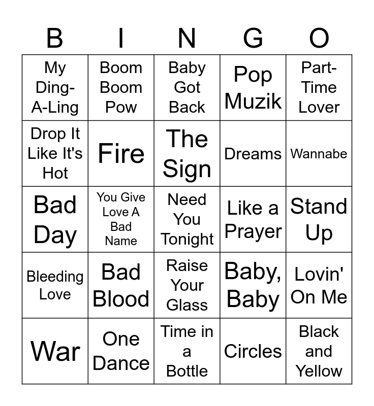 This bingo card has 57 words: Bridge Over Troubled Water, War, Brown Sugar, My Ding-A-Ling, Time in a Bottle, I Shot The Sheriff, Fire, You Should Be Dancing, Dreams, Le Freak, Pop Muzik, Crazy Little Thing Called Love, Keep on Loving You, Jack & Diane, Let's Dance, Ghostbusters, Part-Time Lover, You Give Love A Bad Name, I Wanna Dance with Somebody, Need You Tonight, Like a Prayer, Step by Step, Baby, Baby, Baby Got Back, I Will Always Love You, The Sign, Have You Ever Really Loved A Woman?, No Diggity, Wannabe, I Don't Want to Miss a Thing, Wild WIld West, I Knew I Loved You, U Remind Me, A Moment Like This, Stand Up, Drop It Like It's Hot, We Belong Together, Bad Day, Beautiful Girls, Bleeding Love, Boom Boom Pow, Raise Your Glass, Black and Yellow, We Are Young, Thrift SHop, Fancy, Bad Blood, One Dance, That's What I Like, I Like It, Without Me, Circles, drivers license, Head Waves, Flowers, Lovin' On Me and Die With A Smile.