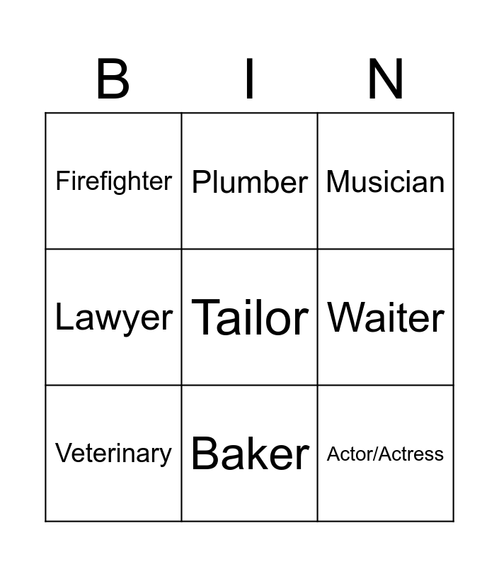 This bingo card has 21 words: Teacher, Dentist, Plumber, Artist, Free!, Veterinary, Firefighter, Musician, Farmer, Baker, Actor/Actress, Lawyer, Cashier, Photographer, Waiter, Doctor, Scientist, Singer, Tailor, Builder and Driver.