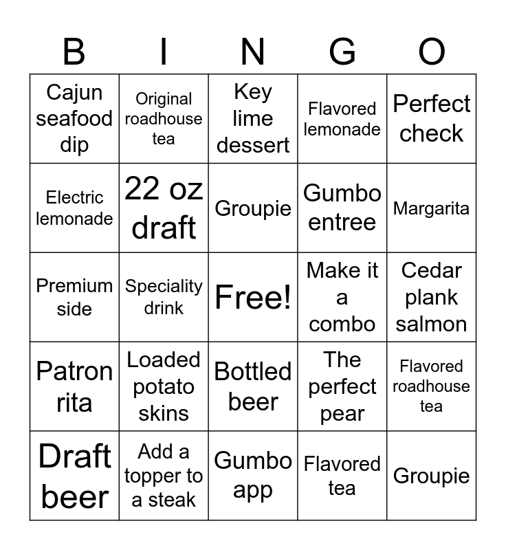 This bingo card has a free space and 24 words: Loaded potato skins, Add a topper to a steak, Groupie, Draft beer, Perfect check, Cajun seafood dip, Electric lemonade, Original roadhouse tea, Make it a combo, Bottled beer, Gumbo entree, Premium side, The perfect pear, Flavored roadhouse tea, 22 oz draft, Flavored tea, Cedar plank salmon, Key lime dessert, Margarita, Speciality drink, Groupie, Patron rita, Flavored lemonade and Gumbo app.