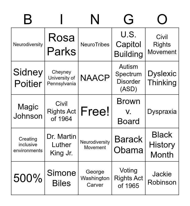 This bingo card has a free space and 46 words: Thurgood Marshall, Jackie Robinson, Hattie McDaniel, George Washington Carver, Dr. Martin Luther King Jr., Harriet Tubman, Rosa Parks, Shirley Chisholm, Sidney Poitier, Nat King Cole, Cheyney University of Pennsylvania, U.S. Capitol Building, Black History Month, Barack Obama, Emancipation Proclamation, 15th Amendment, NAACP, Brown v. Board, Juneteenth, Civil Rights Movement, Civil Rights Act of 1964, Voting Rights Act of 1965, Neurodiversity, Autism Spectrum Disorder (ASD), ADHD, Dyslexic Thinking, 500%, Asperger’s Syndrome, Neurodiversity Movement, Creating inclusive environments, Identity, Intense Focus or Interest, Dyslexia, Embracing Intelligence Diversity, Kindness, Simone Biles, Dyspraxia, Thinking in Pictures, 7 Million, Rob Miller, Neurotypical, NeuroTribes, Magic Johnson, Neurodiversity Presents Opportunities, Carl the Collector and Tourette's syndrome.