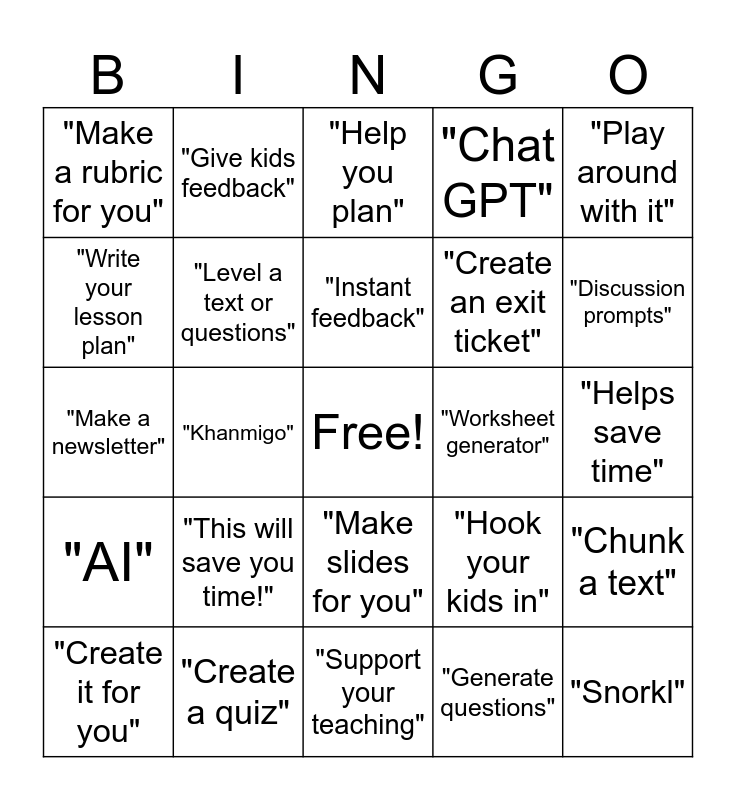 This bingo card has a free space and 24 words: "This will save you time!", "Create a quiz", "Instant feedback", "Create it for you", "Play around with it", "Make a rubric for you", "Write your lesson plan", "Give kids feedback", "Worksheet generator", "Make slides for you", "Create an exit ticket", "Make a newsletter", "Hook your kids in", "Chunk a text", "Level a text or questions", "Generate questions", "Helps save time", "Help you plan", "Discussion prompts", "Khanmigo", "Snorkl", "AI", "Chat GPT" and "Support your teaching".