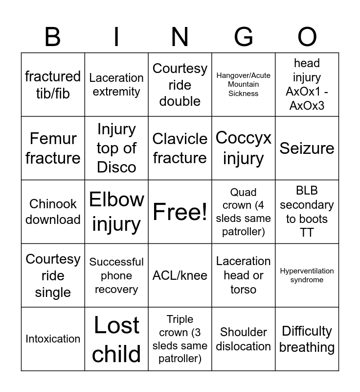 This bingo card has a free space and 26 words: ACL/knee, Shoulder dislocation, Clavicle fracture, Lost child, head injury AxOx1 - AxOx3, fractured tib/fib, Femur fracture, Laceration extremity, BLB secondary to boots TT, Laceration head or torso, Coccyx injury, Chinook download, Hyperventilation syndrome, Intoxication, Elbow injury, Lost ski/snowboard, call from base, Hangover/Acute Mountain Sickness, Courtesy ride single, Courtesy ride double, Difficulty breathing, Seizure, Triple crown (3 sleds same patroller), Quad crown (4 sleds same patroller), Successful phone recovery, Injury top of Disco and Collision.