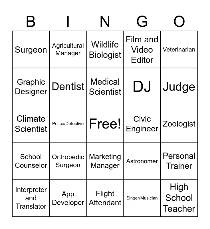 This bingo card has a free space and 24 words: Orthopedic Surgeon, App Developer, Medical Scientist, Interpreter and Translator, Veterinarian, Surgeon, Graphic Designer, Agricultural Manager, Civic Engineer, Marketing Manager, DJ, Climate Scientist, Astronomer, Personal Trainer, Dentist, Singer/Musician, Zoologist, Wildlife Biologist, Judge, Police/Detective, High School Teacher, School Counselor, Film and Video Editor and Flight Attendant.