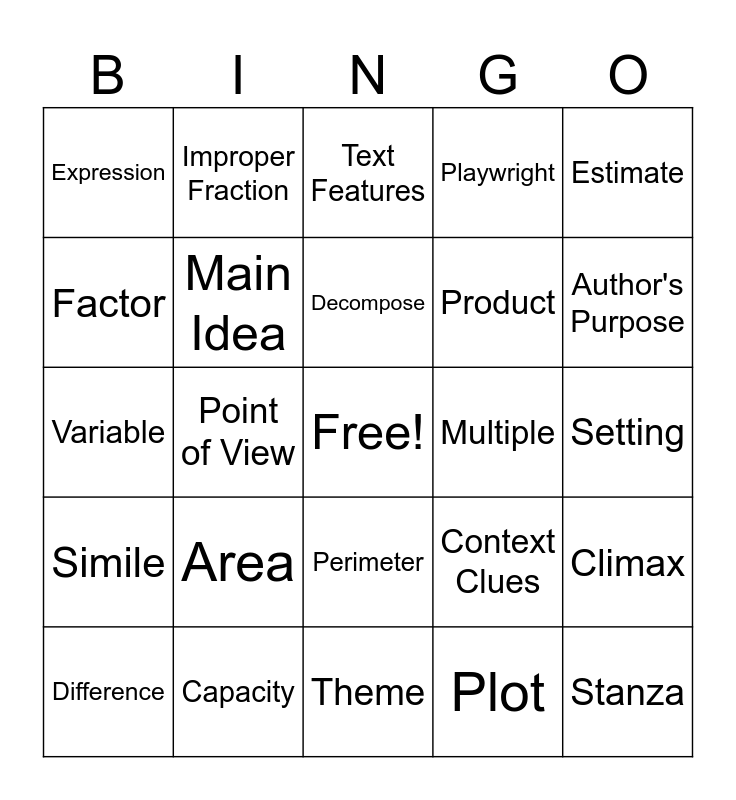This bingo card has a free space and 24 words: Area, Capacity, Decompose, Difference, Estimate, Expression, Factor, Improper Fraction, Multiple, Perimeter, Product, Variable, Context Clues, Climax, Main Idea, Plot, Setting, Text Features, Author's Purpose, Point of View, Stanza, Simile, Playwright and Theme.