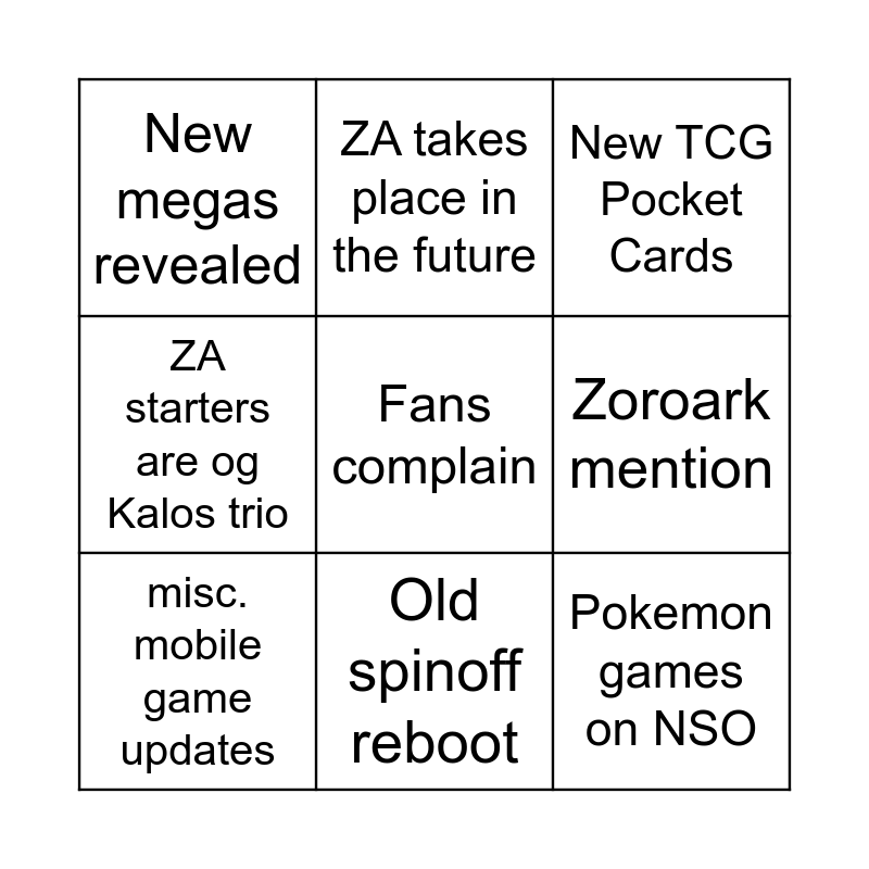 This bingo card has a free space and 8 words: Zoroark mention, New TCG Pocket Cards, ZA takes place in the future, misc. mobile game updates, New megas revealed, Pokemon games on NSO, ZA starters are og Kalos trio and Old spinoff reboot.