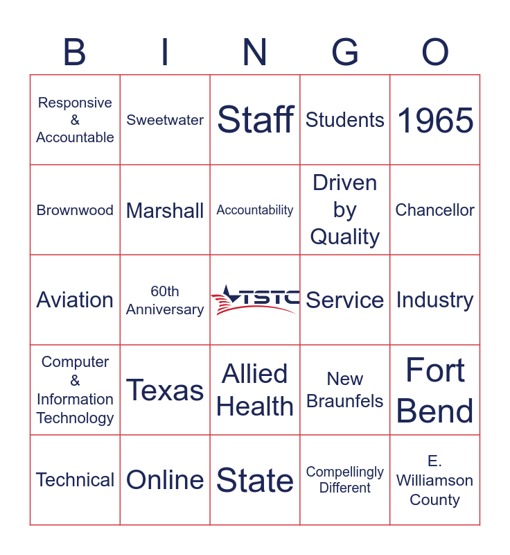 This bingo card has 2 images, a free space and 50 words: E. Williamson County, State, Texas, Abilene, Sweetwater, Breckenridge, Brownwood, North Texas, Marshall, Waco, Fort Bend, New Braunfels, Harlingen, Excellence, Accountability, Service, Integrity, 1965, 60th Anniversary, Compellingly Different, Responsive & Accountable, Driven by Quality, PBE, WIG, JCTI, TSTI, Chancellor, Vice Chancellors, Provosts, Students, Graduates, Alumni, Faculty, Staff, Online, Associate Degree, Dual Credit, Hands On, Career, Industry, Computer & Information Technology, Environmental & Safety, Allied Health, Engineering & Manufacturing, Construction & Maintenance, Aviation, Transportation, Hospitality, Technical and College.