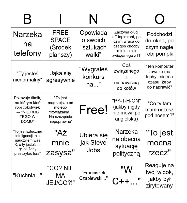 This bingo card has a free space and 25 words: "Aż mnie zasysa", "Franciszek Czaplewski...", "Wygrałeś konkurs na...", "Kuchnia...", Podchodzi do okna, po czym nagle robi pompki, Narzeka na telefony, "Ty jesteś nienormalny", FREE SPACE (Środek planszy), "PY-T-H-ON" (jakby nigdy nie mówił po angielsku), Ubiera się jak Steve Jobs, Coś związanego z nienawiścią do kotów, Pokazuje filmik, na którym ktoś robi cokolwiek → "NIE RÓB TEGO W DOMU", Narzeka na obecną sytuację polityczną, "To jest mocna rzecz", Jąka się agresywnie, Patrzy na komputer Julki → "Po co to tu napisałaś?", "Co ty tam mamroczesz pod nosem?", Opowiada o swoich "sztukach walki", "Ten komputer zawsze ma fochy i nie ma czasu, żeby go naprawić", "To jest mądrzejsze od mojego rozwiązania... Na szczęście niepoprawne", Reaguje na twój widok, jakby był zirytowany, "CO? NIE MA JEJ/GO?!", "To jest sztucznej inteligencji, nie nauczyłem was X, a ty jesteś za głupi, żeby przeczytać fora", Zaczyna długi off-topic rant, po czym wraca do czegoś choćby minimalnie związanego z IT and "W C++...".