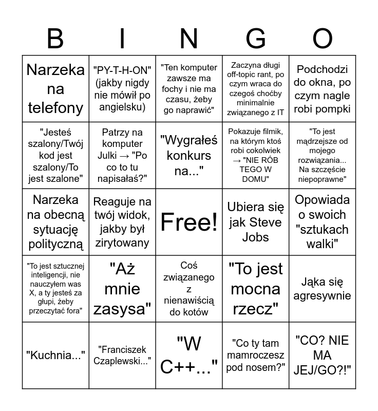 This bingo card has a free space and 24 words: "Aż mnie zasysa", "Franciszek Czaplewski...", "Wygrałeś konkurs na...", "Kuchnia...", Podchodzi do okna, po czym nagle robi pompki, Narzeka na telefony, "Jesteś szalony/Twój kod jest szalony/To jest szalone", "PY-T-H-ON" (jakby nigdy nie mówił po angielsku), Ubiera się jak Steve Jobs, Coś związanego z nienawiścią do kotów, Pokazuje filmik, na którym ktoś robi cokolwiek → "NIE RÓB TEGO W DOMU", Narzeka na obecną sytuację polityczną, "To jest mocna rzecz", Jąka się agresywnie, Patrzy na komputer Julki → "Po co to tu napisałaś?", "Co ty tam mamroczesz pod nosem?", Opowiada o swoich "sztukach walki", "Ten komputer zawsze ma fochy i nie ma czasu, żeby go naprawić", "To jest mądrzejsze od mojego rozwiązania... Na szczęście niepoprawne", Reaguje na twój widok, jakby był zirytowany, "CO? NIE MA JEJ/GO?!", "To jest sztucznej inteligencji, nie nauczyłem was X, a ty jesteś za głupi, żeby przeczytać fora", Zaczyna długi off-topic rant, po czym wraca do czegoś choćby minimalnie związanego z IT and "W C++...".