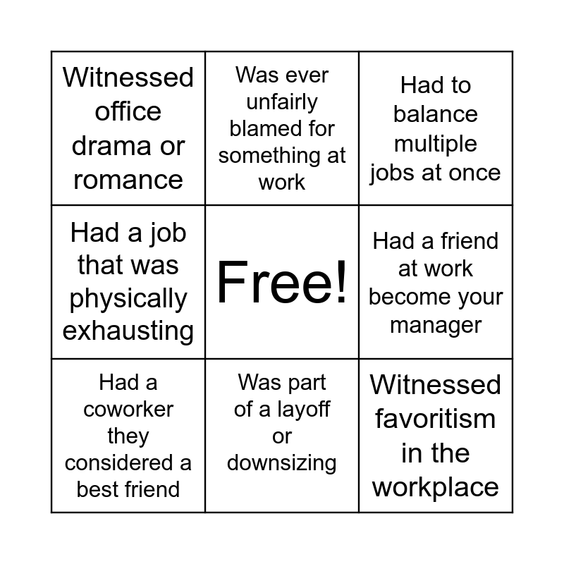 This bingo card has a free space and 14 words: Had a boss they couldn't stand, Sent a work email with a huge mistake, Had a coworker they considered a best friend, Was ever unfairly blamed for something at work, Had a job that was physically exhausting, Witnessed favoritism in the workplace, Stayed at a bad job because there were no other options, Worked at a job where you felt invisible or under appreciated, Was part of a layoff or downsizing, Witnessed office drama or romance, Left a job because they saw no growth, Had a friend at work become your manager, Had to balance multiple jobs at once and Had to work with someone you didn't like.