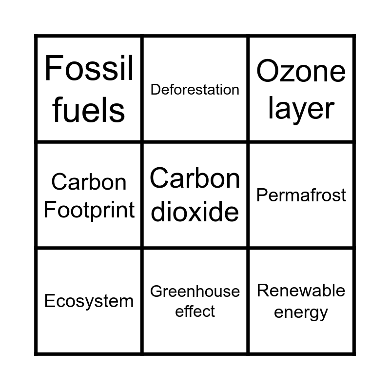 This bingo card has 26 words: Free!, Atmosphere, Greenhouse effect, Greenhouse gas, Carbon dioxide, Fossil fuels, Permafrost, Deforestation, Solar radiation, Methane, Renewable energy, Temperature rise, Climate, Global warming, Ice caps, Sea level rise, Carbon Footprint, Emission, Ozone layer, Sustainability, Pollution, Glacier, Extreme weather, Acid rain, Ecosystem and Biodiversity.