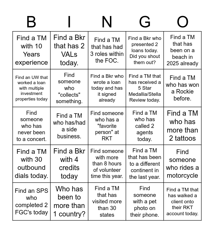 This bingo card has a free space and 24 words: Find a Bkr with 4 credits today, Who has been to more than 1 country?, Find a Bkr who wrote a loan today and has it signed already, Find an SPS who completed 2 FGC's today, Find a TM that has been on a beach in 2025 already, Find a TM with 10 Years experience, Find an UW that worked a loan with multiple investment properties today, Find a Bkr that has 2 VALs today., Find a TM who has called 2 agents today., Find someone with more than 8 hours of volunteer time this year., Find a TM that has received a 5 Star Medallia/Stella Review today., Find someone who has never been to a concert., Find a TM that has been to a different continent in the last year., Find someone who rides a motorcycle, Find someone who "collects" something., Find someone with a pet photo on their phone., Find a TM who has more than 2 tattoos, Find a TM that has had 3 roles within the FOC., Find a TM who has won a Rockie before., Find a TM who has/had a side business., Find a TM that has walked a client onto their RKT account today., Find a TM with 30 outbound dials today., Find a Bkr who presented 2 loans today. Did you shout them out? and Find a TM that has visited more than 30 states.