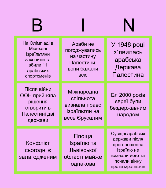 This bingo card has a free space and 8 words: Бл 2000 років євреї були бездержавним народом, У 1948 році з´явилась арабська Держава Палестина, Араби не погоджувались на частину Палестини, вони бажали всю, Конфлікт сьогодні є залагодженим, На Олімпіаді в Мюнхені ізраїльтяни захопили та вбили 11 арабських спортсменів, Сусідні арабські держави після проголошення Ізраїлю не визнали його та почали війну проти ізраїльтян, Після війни ООН прийняла рішення створити в Палестині дві держави and Площа Ізраїлю та Львівської області майже однакова.
