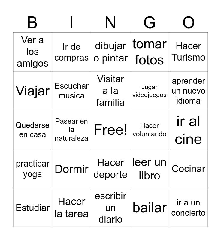 This bingo card has a free space and 24 words: Dormir, Hacer la tarea, Visitar a la familia, Estudiar, Hacer Turismo, Ver a los amigos, Viajar, Ir de compras, Hacer voluntarido, Hacer deporte, Jugar videojuegos, Quedarse en casa, leer un libro, Cocinar, Escuchar musica, bailar, ir al cine, dibujar o pintar, aprender un nuevo idioma, Pasear en la naturaleza, ir a un concierto, practicar yoga, tomar fotos and escribir un diario.