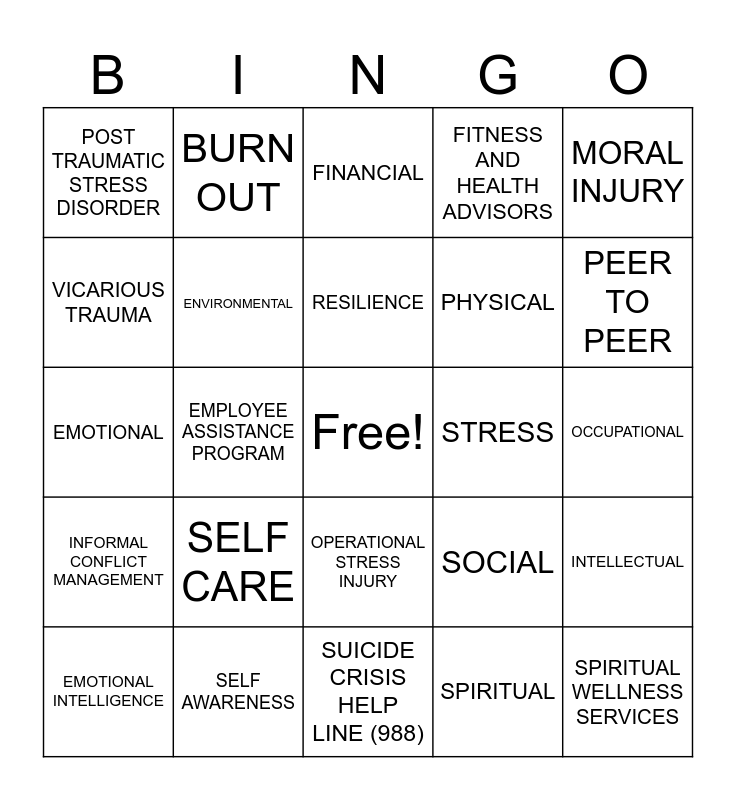 This bingo card has a free space and 24 words: SELF CARE, SELF AWARENESS, RESILIENCE, EMOTIONAL INTELLIGENCE, MORAL INJURY, POST TRAUMATIC STRESS DISORDER, VICARIOUS TRAUMA, BURN OUT, STRESS, OPERATIONAL STRESS INJURY, PHYSICAL, EMOTIONAL, SOCIAL, INTELLECTUAL, ENVIRONMENTAL, SPIRITUAL, OCCUPATIONAL, FINANCIAL, PEER TO PEER, EMPLOYEE ASSISTANCE PROGRAM, SPIRITUAL WELLNESS SERVICES, INFORMAL CONFLICT MANAGEMENT, FITNESS AND HEALTH ADVISORS and SUICIDE CRISIS HELP LINE (988).