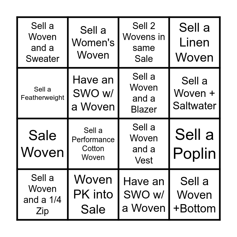 This bingo card has 16 words: Woven PK into Sale, Sell a Poplin, Sell 2 Wovens in same Sale, Sell a Woven and a Sweater, Sale Woven, Sell a Women's Woven, Sell a Woven and a Vest, Have an SWO w/ a Woven, Sell a Featherweight, Have an SWO w/ a Woven, Sell a Woven and a 1/4 Zip, Sell a Linen Woven, Sell a Performance Cotton Woven, Sell a Woven + Saltwater, Sell a Woven and a Blazer and Sell a Woven +Bottom.