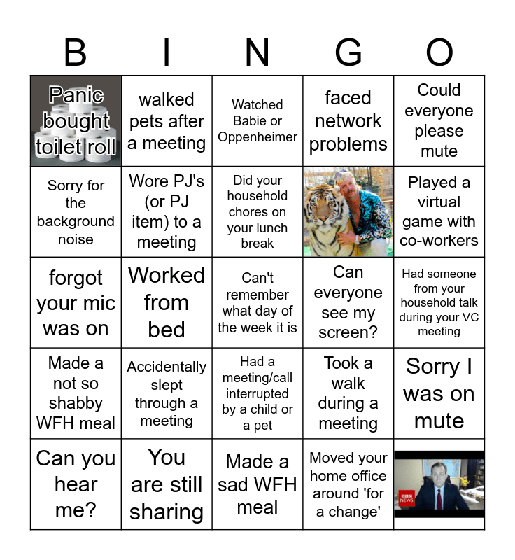 This bingo card has 3 images, a free space and 27 words: Napped between meetings, You are still sharing, Watched Babie or Oppenheimer, Worked from your backyard, porch, or balcony?, Could everyone please mute, Panic bought toilet roll, Wore PJ's (or PJ item) to a meeting, Did your household chores on your lunch break, Can everyone see my screen?, Sorry I was on mute, Can you hear me?, Worked from bed, Moved your home office around 'for a change', forgot your mic was on, Lost power/internet during the workday, Made a sad WFH meal, Took a walk during a meeting, Played a virtual game with co-workers, Made a not so shabby WFH meal, Accidentally slept through a meeting, Had virtual drinks with co-worker/s, Had someone from your household talk during your VC meeting, Sorry for the background noise, walked pets after a meeting, Had a meeting/call interrupted by a child or a pet, faced network problems and New skill or hobby.