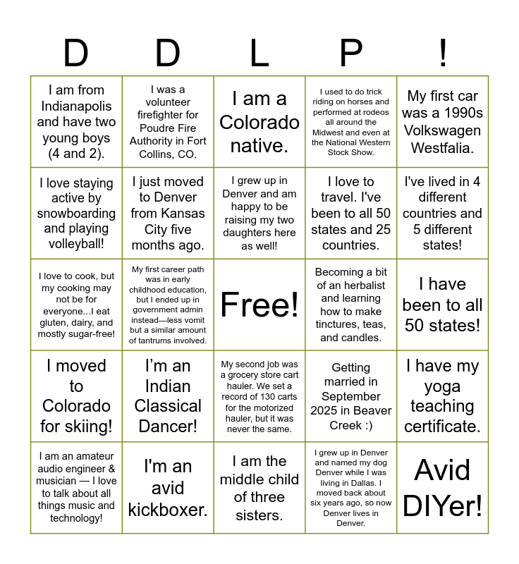 This bingo card has a free space and 55 words: I have been to over 40 countries., I am an amateur audio engineer & musician — I love to talk about all things music and technology!, I am first-generation American! My mom is from Vietnam and my dad is from Northern Ireland., I am from Indianapolis and have two young boys (4 and 2)., I am the middle child of three sisters., I biked across America!, I just moved to Denver from Kansas City five months ago., I like to rollerblade!, I love to travel. I've been to all 50 states and 25 countries., My favorite kitchen appliance is an espresso machine., I used to do trick riding on horses and performed at rodeos all around the Midwest and even at the National Western Stock Show., I was an extra in the pilot episode of East Bound and Down., I’m mildly obsessed with flamingos., I’m originally from NYC and I was on Judge Judy many moons ago., I'm a native Coloradoan who moved to New York for 13 years before coming back, so I'm half a transplant!, Moved to Salt Lake City to start my career but moved (back) to Denver because it's a way cooler city!, My first car was a 1990s Volkswagen Westfalia., My first career path was in early childhood education, but I ended up in government admin instead—less vomit but a similar amount of tantrums involved., Once upon a time, I studied abroad in Ecuador. While in the Amazon, I caught a piranha with a stick, string, and hook in a canoe. I still have the skull. :), Avid DIYer!, Becoming a bit of an herbalist and learning how to make tinctures, teas, and candles., Flava Flav asked me to marry him!, Getting married in September 2025 in Beaver Creek :), I am a Colorado native., I am an avid fan of bike racing and went to watch the Tour de France last year!, I grew up in Denver and am happy to be raising my two daughters here as well!, I grew up in Denver and named my dog Denver while I was living in Dallas. I moved back about six years ago, so now Denver lives in Denver., I have been to 13 different countries!, I have been to all 50 states!, I have my yoga teaching certificate., I hit a home run at Coors Field during a season ticket holder batting practice event., I love gardening and native plants!, I LOVE golf. Not the best at it, but it's one of my most favorite hobbies. I’m also newer to Denver (from CA)—moved here 2.5 years ago., I love solving puzzles—whether it’s through design challenges at work or getting creative with a 3D printer on a weekend., I love staying active by snowboarding and playing volleyball!, I love to cook, but my cooking may not be for everyone...I eat gluten, dairy, and mostly sugar-free!, I love to golf and fish!, I moved to Colorado for skiing!, I once had a skydive where I was under the parachute "falling" to the ground for over 30 minutes (typical time is 5 minutes). A weather event was to blame..., I really love Mexican food and typically go to La Loma downtown every single Friday for dinner., I was a volunteer firefighter for Poudre Fire Authority in Fort Collins, CO., I was born and raised in Minnesota but traveled to Colorado every year to ski., I was on the cover of an Eric Church CD (very small!)., I wrote my high school's alma mater/fight song., I’m an Indian Classical Dancer!, I'm an avid kickboxer., In my free time, I enjoy fly fishing, golf, and photography. Fun fact: I've had a drink with Bill Murray twice., In undergrad, I did a program called Semester at Sea where you live and go to school on a cruise ship and circumnavigate the world. It was an amazing experience and shaped me as a person., Instead of the usual Thanksgiving dinner, my family challenged ourselves to an international adventure for the holiday week. For the past six years, we've swapped turkey for travel vibes, exploring amazing destinations like Costa Rica, Ireland,, I've lived in 4 different countries and 5 different states!, My college roommates and I cooked for each other every night. We only repeated something three times in a span of 9 months., My family's ranch was included in a spread in National Geographic., My greatest regret is that I do not have a go-to karaoke song., My second job was a grocery store cart hauler. We set a record of 130 carts for the motorized hauler, but it was never the same. and On the hunt for the best breakfast spot in Denver!.
