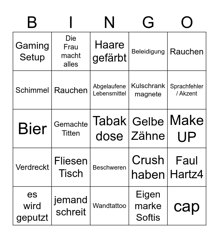 This bingo card has a free space and 24 words: Fliesen Tisch, jemand schreit, Abgelaufene Lebensmittel, es wird geputzt, Rauchen, Gaming Setup, Schimmel, Die Frau macht alles, Gelbe Zähne, Beschweren, Kulschrank magnete, Bier, Crush haben, Faul Hartz4, Rauchen, Eigen marke Softis, Make UP, Haare gefärbt, Sprachfehler / Akzent, Gemachte Titten, cap, Verdreckt, Beleidigung and Wandtattoo.
