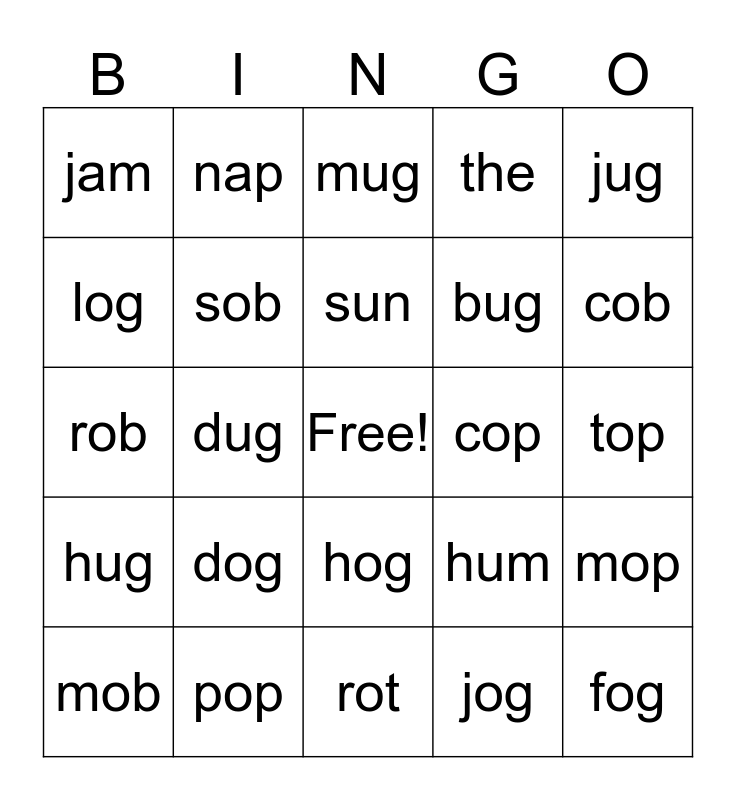 This bingo card has a free space and 24 words: dog, pop, sun, mob, jug, jam, log, nap, cop, hog, bug, rob, hum, mop, sob, jog, top, mug, cob, dug, fog, hug, the and rot.