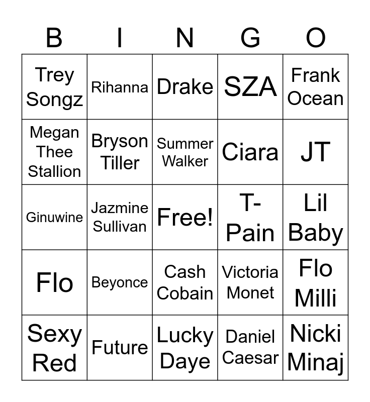 This bingo card has a free space and 46 words: Doechii, Nicki Minaj, Smino, Lucky Daye, Beyonce, Chris Brown, Rihanna, Kendrick Lamar, Megan Thee Stallion, Leon Thomas, Bryson Tiller, SZA, Flo Milli, Victoria Monet, Big Sean, Travis Scott, Summer Walker, T-Pain, 6lack, Frank Ocean, Jazmine Sullivan, Daniel Caesar, Trey Songz, Ciara, Usher, JT, Sexy Red, Giveon, Cash Cobain, Flo, Lil Mama, August Alsina, Gunna, Meek Mill, J. Cole, Future, Lil Baby, Migos, Ari Lennox, Solange, Glorilla, Drake, Ginuwine, 50 Cent, Ludacris and Brent Faiyaz.