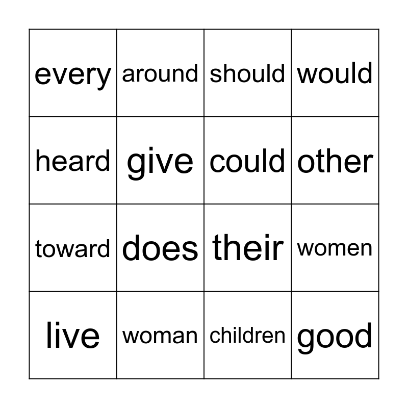 This bingo card has 16 words: woman, women, should, every, toward, around, their, children, heard, give, live, would, does, other, could and good.