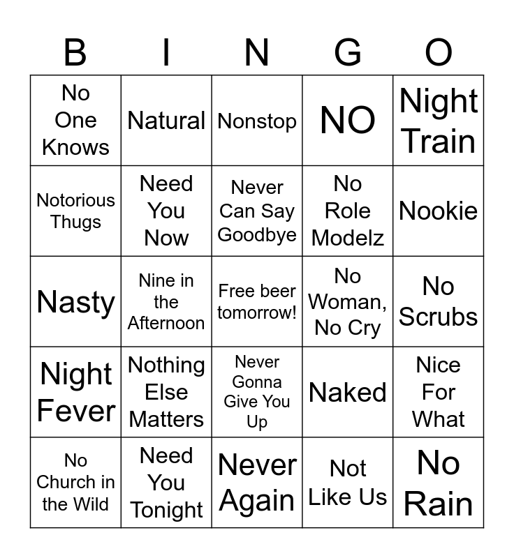This bingo card has a free space and 40 words: Name, Nasty, Naughty Girl, Need You Now, Need You Tonight, Never Gonna Give You Up, Never Can Say Goodbye, New York, New York, Night Train, Night Fever, Nine in the Afternoon, NO, No Rain, No Scrubs, No Woman, No Cry, Nothing Else Matters, Never Knew Love Like This Before, No One Knows, Nuthin But a G Thang, Nonstop, Nice For What, Not Like Us, No Role Modelz, Notorious Thugs, No Sleep Til Brooklyn, Now That We Found Love, No More Mr Nice Guy, Nadine, Never Too Much, No Diggity, Nothin', No Church in the Wild, New Rules, Naked, Nookie, Never Again, No, No, No, Need a Favor, Natural and Never Leave You.