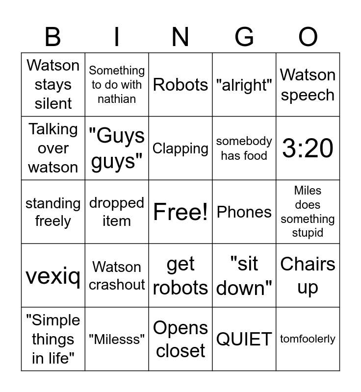 This bingo card has a free space and 24 words: Watson crashout, "Milesss", Clapping, "Simple things in life", Watson speech, Watson stays silent, Talking over watson, Something to do with nathian, Phones, get robots, somebody has food, standing freely, "sit down", Chairs up, "Guys guys", QUIET, Miles does something stupid, Robots, 3:20, dropped item, tomfoolerly, vexiq, "alright" and Opens closet.