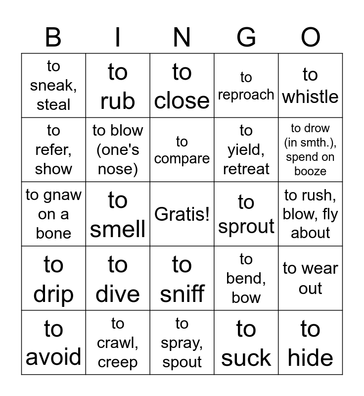 This bingo card has a free space and 30 words: to crawl, creep, to give off fluff, to smell, to push, shove, to sneak, steal, to close, to blow (one's nose), to sniff, to sprout, to spray, spout, to rush, blow, fly about, to hide, to suck, to drink, booze, to drow (in smth.), spend on booze, to spit, to bend, bow, to drip, to dive, to whistle, to gnaw on a bone, to be silent, to rub, to yield, retreat, to refer, show, to reproach, to wear out, to avoid, to compare and to disappear.