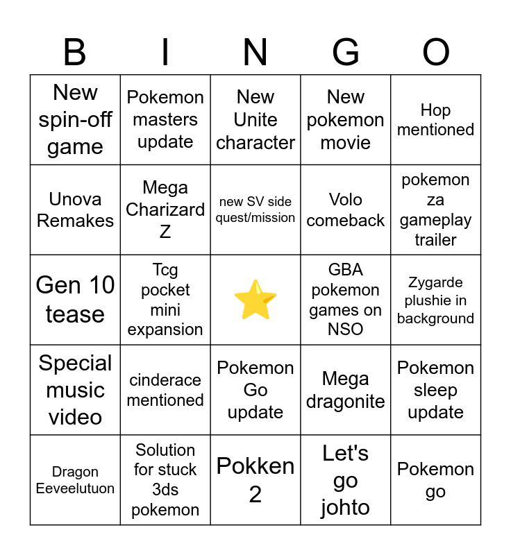 This bingo card has a free space and 24 words: cinderace mentioned, Solution for stuck 3ds pokemon, new SV side quest/mission, Dragon Eeveelutuon, Hop mentioned, New spin-off game, Unova Remakes, Pokemon masters update, GBA pokemon games on NSO, Pokemon Go update, Volo comeback, Gen 10 tease, Mega dragonite, Pokemon sleep update, Mega Charizard Z, Let's go johto, Zygarde plushie in background, New Unite character, pokemon za gameplay trailer, Tcg pocket mini expansion, Pokemon go, Special music video, New pokemon movie and Pokken 2.