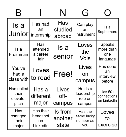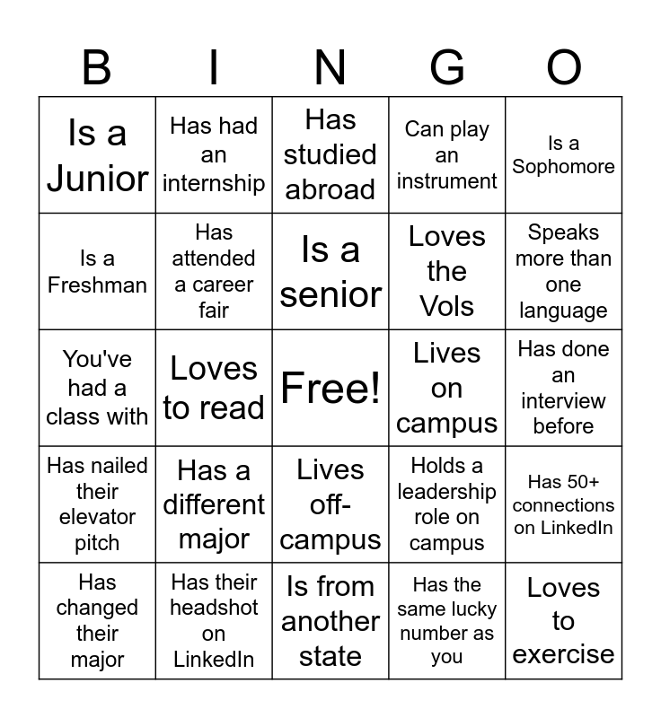 This bingo card has a free space and 25 words: Has a different major, Is from another state, Is a senior, Has changed their major, Is a Sophomore, Is a Junior, Is a Freshman, Has had an internship, Lives on campus, Lives off-campus, Loves the Vols, You've had a class with, Holds a leadership role on campus, Has 50+ connections on LinkedIn, Has attended a career fair, Has a dream job, Has done an interview before, Has studied abroad, Speaks more than one language, Loves to read, Loves to exercise, Has their headshot on LinkedIn, Has nailed their elevator pitch, Can play an instrument and Has the same lucky number as you.