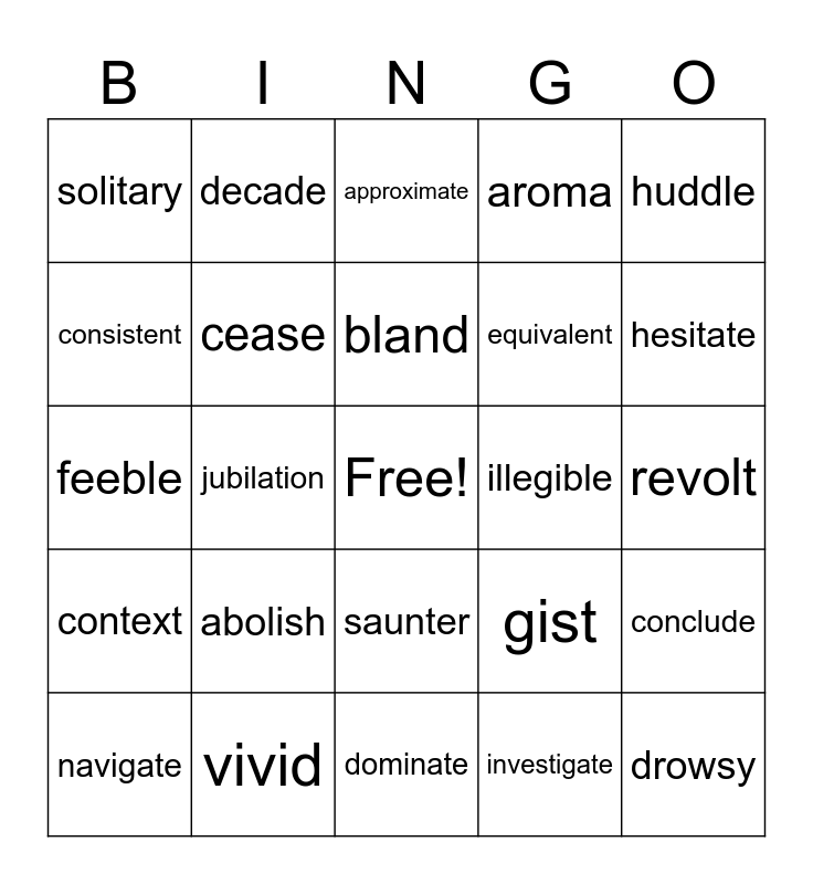 This bingo card has a free space and 24 words: abolish, vivid, bland, navigate, huddle, solitary, consistent, decade, illegible, saunter, equivalent, feeble, gist, conclude, cease, investigate, revolt, approximate, hesitate, jubilation, drowsy, context, aroma and dominate.