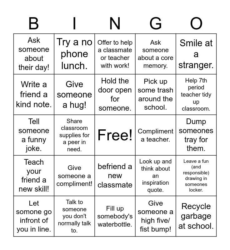 This bingo card has a free space and 24 words: Give someone a compliment!, Talk to someone you don't normally talk to., Hold the door open for someone., Let somone go infront of you in line., Smile at a stranger., Ask someone about their day!, Write a friend a kind note., Try a no phone lunch., Compliment a teacher., befriend a new classmate, Pick up some trash around the school., Tell someone a funny joke., Look up and think about an inspiration quote., Leave a fun (and responsible) drawing in someones locker., Give someone a hug!, Give someone a high five/ fist bump!, Dump someones tray for them., Offer to help a classmate or teacher with work!, Help 7th period teacher tidy up classroom., Share classroom supplies for a peer in need., Recycle garbage at school., Teach your friend a new skill!, Ask someone about a core memory. and Fill up somebody's waterbottle..