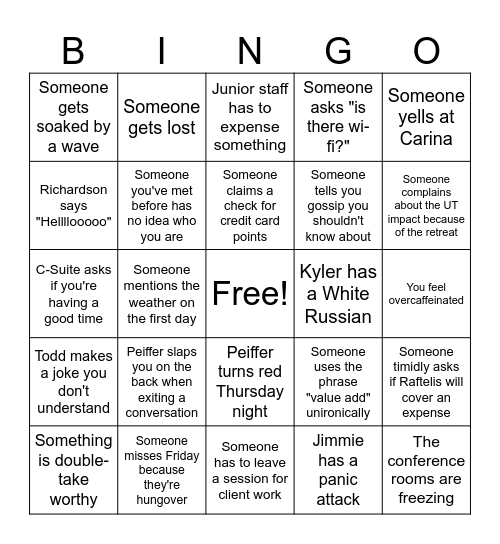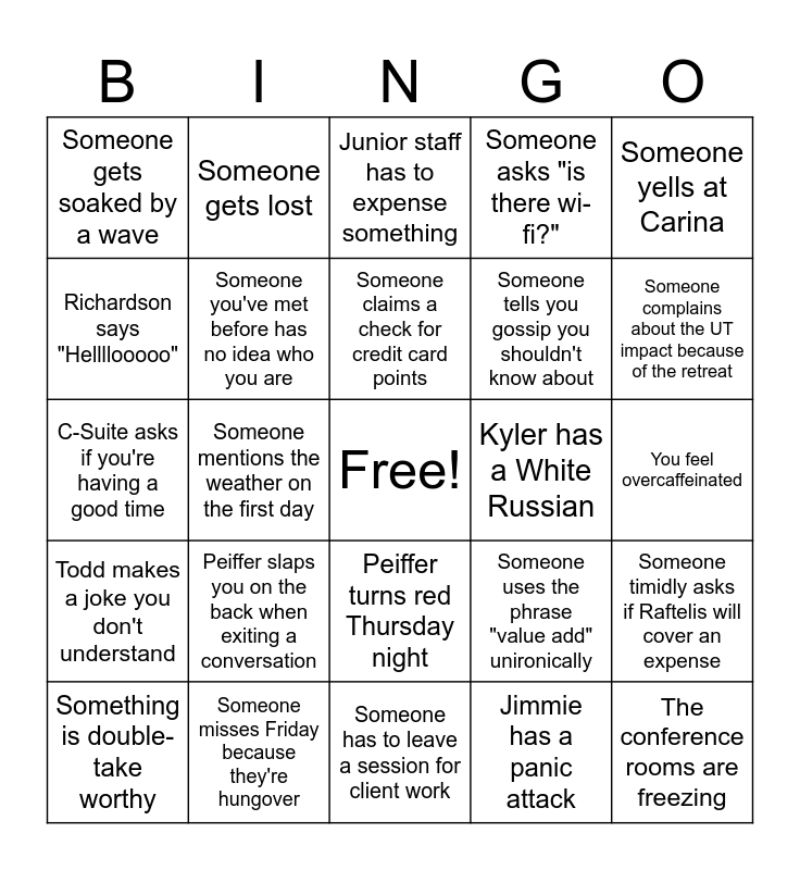 This bingo card has a free space and 32 words: Jimmie has a panic attack, Someone proposes unprofessional work activity, Someone mentions the weather on the first day, Someone gets Covid, Todd makes a joke you don't understand, Someone you've met before has no idea who you are, Someone yells at Carina, Someone timidly asks if Raftelis will cover an expense, Someone gets lost, 20 people approach Carina for IT support, Someone claims a check for credit card points, Junior staff has to expense something, We clap for the shareholders, Something is unintentionally funny in a session, Kyler has a White Russian, Someone brings up politics, Something is double-take worthy, C-Suite asks if you're having a good time, Peiffer turns red Thursday night, Peiffer slaps you on the back when exiting a conversation, Someone uses the phrase "value add" unironically, Someone complains about the hotel food, You feel overcaffeinated, Someone misses Friday because they're hungover, The conference rooms are freezing, Someone asks "is there wi-fi?", Someone tells you gossip you shouldn't know about, Richardson says "Hellllooooo", Someone gets soaked by a wave, Someone has to leave a session for client work, UT is brought up and Someone complains about the UT impact because of the retreat.