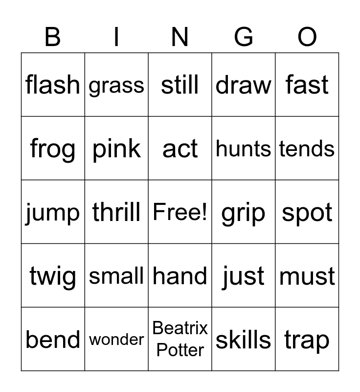 This bingo card has a free space and 24 words: small, wonder, act, bend, fast, flash, frog, grass, grip, hand, hunts, jump, just, must, pink, skills, spot, still, tends, thrill, trap, twig, draw and Beatrix Potter.