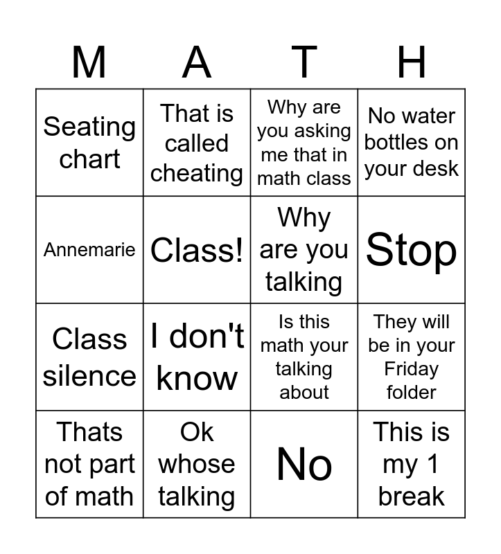 This bingo card has 24 words: Class out, Focus on math, Stop, Sit in the front, Annemarie, Seating chart, Class!, That is called cheating, Ok whose talking, Stop talking, Class silence, Is this math your talking about, Yes there's homework, Shh..., Why are you talking, I'm getting there, No, Why are you asking me that in math class, I don't know, They will be in your Friday folder, Thats not part of math, This is my 1 break, No water bottles on your desk and Math is not funny.