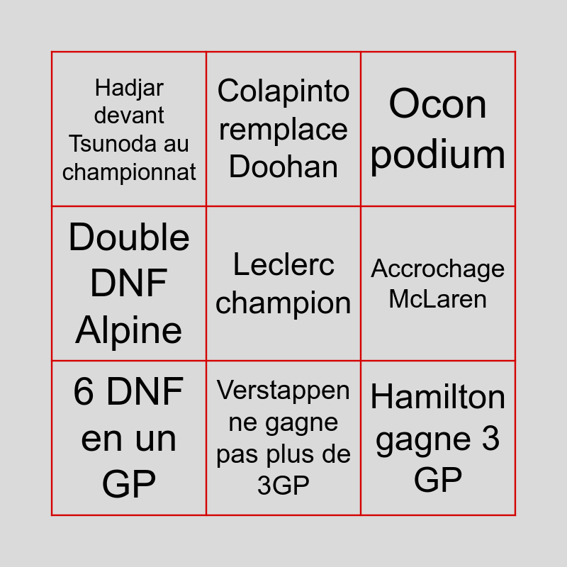 This bingo card has a free space and 8 words: Accrochage McLaren, Ocon podium, Colapinto remplace Doohan, 6 DNF en un GP, Hadjar devant Tsunoda au championnat, Hamilton gagne 3 GP, Double DNF Alpine and Verstappen ne gagne pas plus de 3GP.