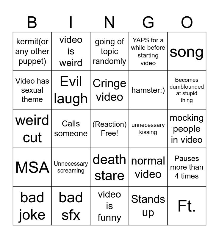 This bingo card has a free space and 24 words: Unnecessary screaming, bad sfx, Cringe video, bad joke, song, kermit(or any other puppet), Video has sexual theme, video is weird, unnecessary kissing, death stare, hamster:), weird cut, normal video, Pauses more than 4 times, Evil laugh, Stands up, mocking people in video, going of topic randomly, Becomes dumbfounded at stupid thing, Calls someone, Ft., MSA, YAPS for a while before starting video and video is funny.