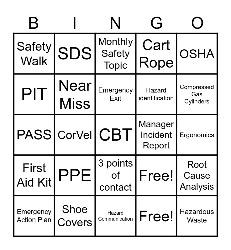 This bingo card has 25 words: PPE, Hazard Communication, Emergency Exit, Emergency Action Plan, OSHA, Safety Walk, PIT, SDS, Manager Incident Report, 3 points of contact, Hazard identification, PASS, Free!, Root Cause Analysis, Near Miss, Hazardous Waste, Ergonomics, Monthly Safety Topic, Compressed Gas Cylinders, CorVel, CBT, Shoe Covers, First Aid Kit, Cart Rope and Free!.