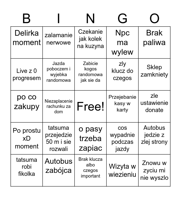 This bingo card has a free space and 24 words: tatsuma przejedzie 50 m i sie rozwali, Autobus zabójca, Zabicie kogos randomowa jak sie da, tatsuma robi fikolka, Brak paliwa, Delirka moment, Live z 0 progresem, zalamanie nerwowe, Przejebanie kasy w karty, o pasy trzeba zapiac, zly klucz do czegos, po co zakupy, cos wypadnie podczas jazdy, Autobus jedzie z zlej strony, Jazda poboczem i wyjebka randomowa, Wizyta w wiezieniu, zle ustawienie donate, Czekanie jak kolek na kuzyna, Sklep zamkniety, Niezaplacenie rachunku za dom, Znowu w zyciu mi nie wyszlo, Po prostu xD moment, Npc ma wylew and Brak klucza albo czegos important.