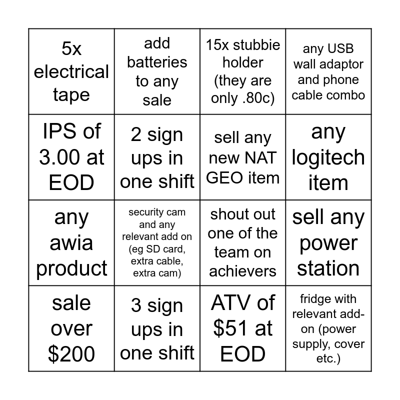 This bingo card has 16 words: 3 sign ups in one shift, sell any power station, 15x stubbie holder (they are only .80c), 5x electrical tape, any awia product, add batteries to any sale, shout out one of the team on achievers, ATV of $51 at EOD, IPS of 3.00 at EOD, 2 sign ups in one shift, sale over $200, any USB wall adaptor and phone cable combo, security cam and any relevant add on (eg SD card, extra cable, extra cam), any logitech item, sell any new NAT GEO item and fridge with relevant add-on (power supply, cover etc.).